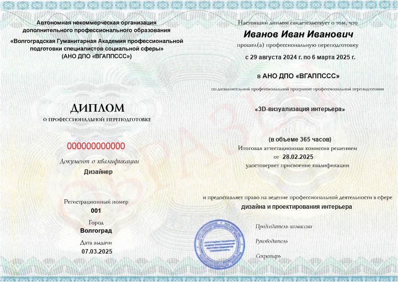 Обучение по такой программе – способ освоить новую профессию на основе ранее полученного образования. В дипломе выпускника указывается его ФИО, наименование учебной организации, название и длительность программы. Документ заверяется подписью руководителя и печатью АНО ДПО «ВГАППССС».