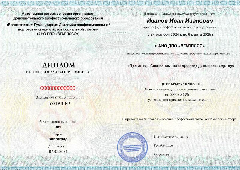 Обучение по такой программе – способ освоить новую профессию на основе ранее полученного образования. В дипломе выпускника указывается его ФИО, наименование учебной организации, название и длительность программы. Документ заверяется подписью руководителя и печатью АНО ДПО «ВГАППССС».