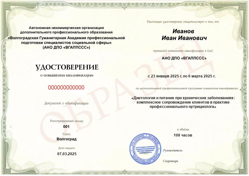 Диетология и питание при хронических заболеваниях: комплексное сопровождение клиентов в практике профессионального нутрициолога (108ч)