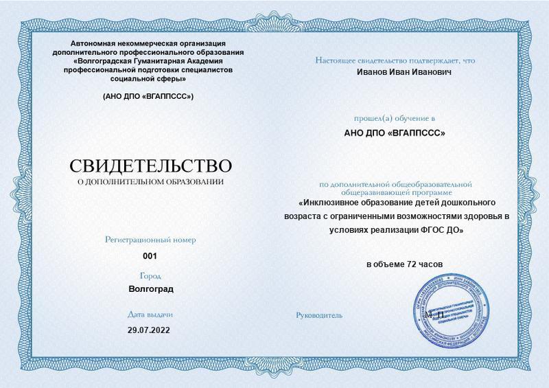 Выдаваемый документ: Свидетельство о дополнительном образовании